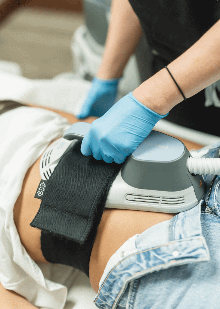 Emsculpt uses High-Intensity Focused Electromagnetic (HIFEM) pulses to induce involuntary muscle contractions, simulating an intense workout to build muscle tissue and improve it’s tone. The procedure is non-invasive and requires no downtime. Each session lasts around 30 minutes and induces around 20 thousand muscle contractions.